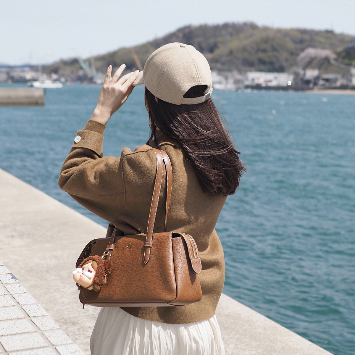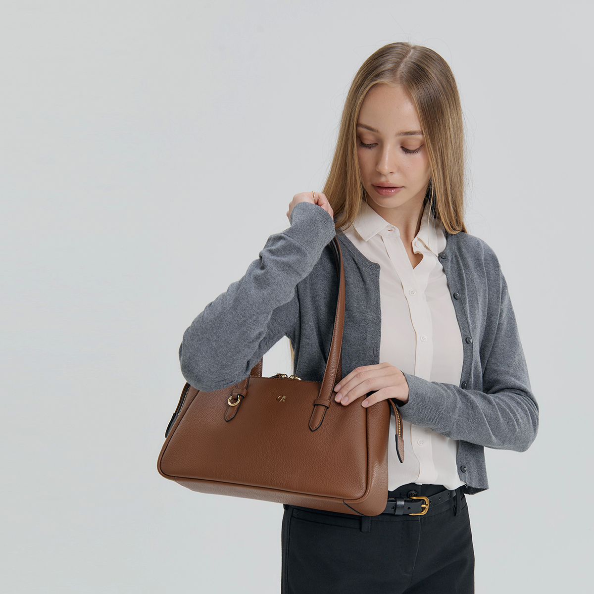 กระเป๋าสะพายไหล่ ทรงเรียบเก๋ขนาดกำลังดี โชว์ลายหนังสวยของหนังวัวแท้ มีช่องแบ่งด้านในเป็นสัดส่วน จุของจำเป็นครบ กระเป๋าสตางค์ใบยาว ร่มพับ หนังสือA5 ใส่ได้